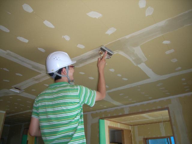 内装やさんが、壁・天井のクロス仕上部分のパテ処理中です。