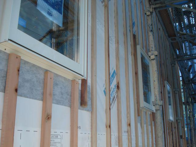 窓の取り付けが完了して、透湿防水シート張り、通気胴縁の取り付けをしているところです。