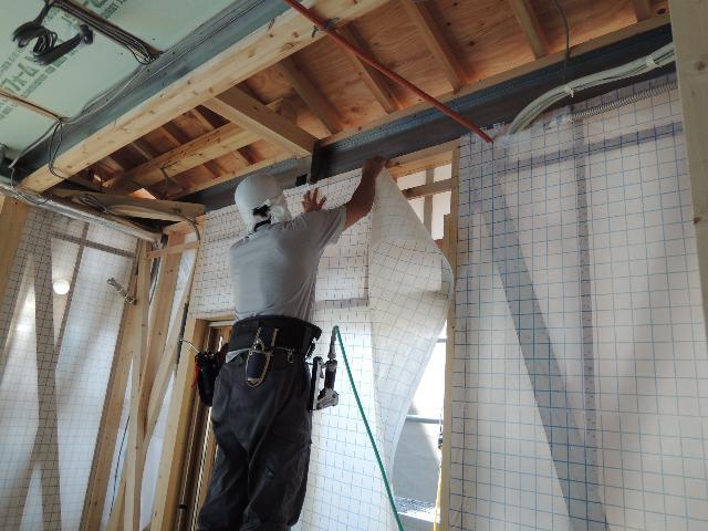 外周廻りの下地入れが完了し、断熱工事業者さんが乗り込みです。