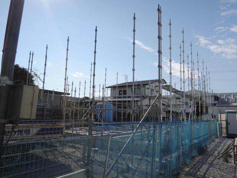 軸組み建て方の前に外部足場の組立です。
