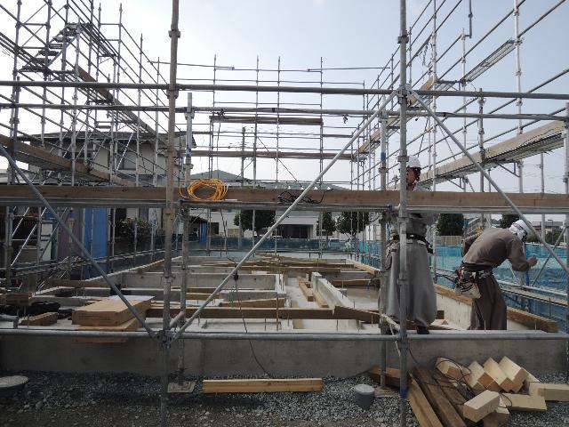 仮設足場の組立も無事終わり、本日は土台取付作業です。