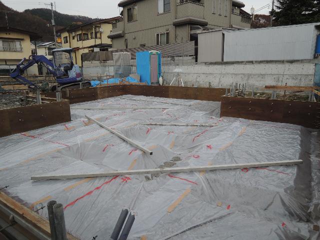 外周の立上り型枠建て、防湿フィルムの敷き込みが完了し、内部立上り鉄筋の位置出しを行いました。
