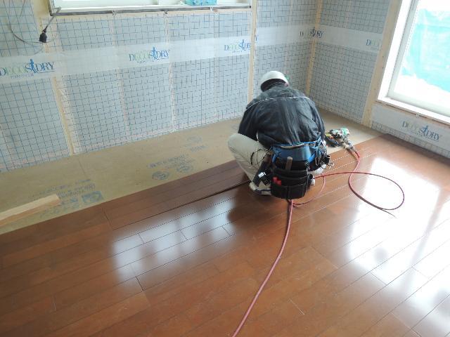 2階の床貼の状況です。2階は、『エクセルブラウン』色のフローリングです。