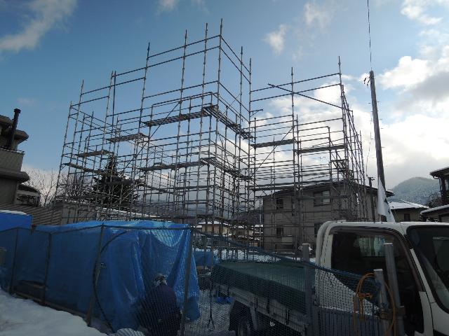昨日外部足場の組立作業が完了し、本日は土台の敷き込み作業です。いよいよ大工さんの現場作業が始まります。