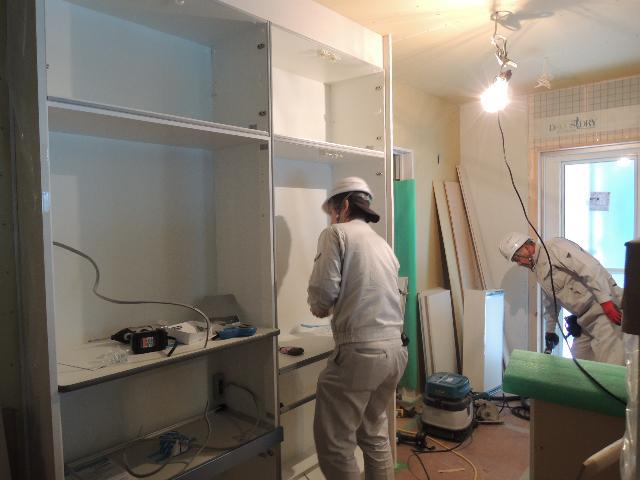 キッチン組立です。カップボード(食器棚)から取付スタートです。