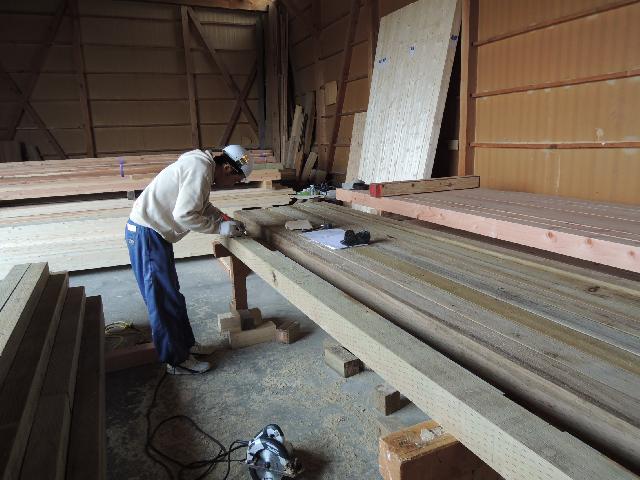 現場での建て方作業前に、土台,柱,母屋,小屋束等々の墨付け・加工をここで行います。