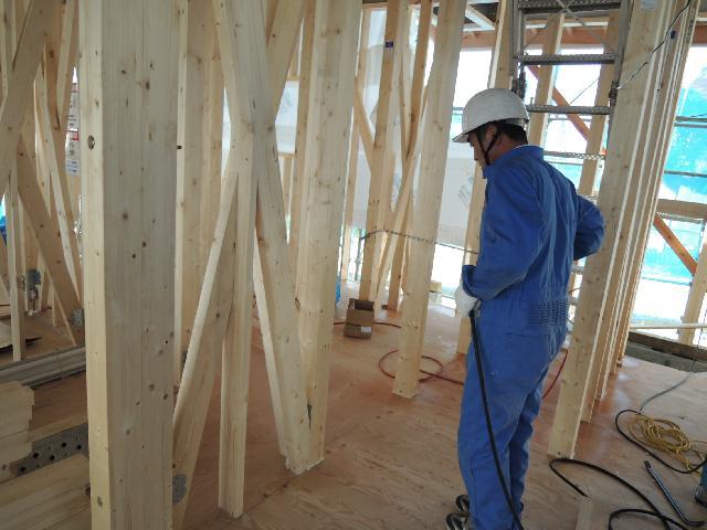 防蟻処理の施工状況です。床を貼る前に土台・大引きの防蟻処理は終了しており、本日は間柱・筋交い(立ち上り部)の防蟻処理です。
