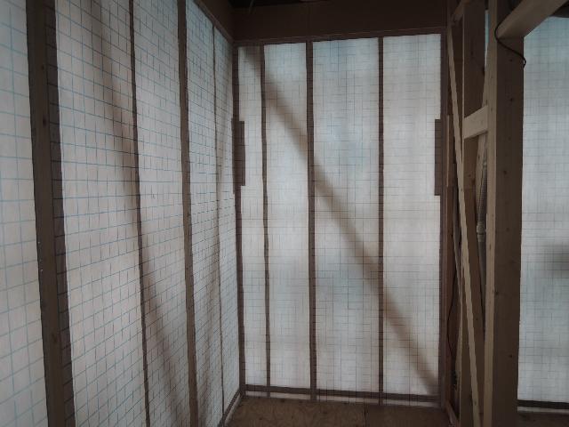 壁の断熱工事、セルロースファイバーを使用した「デコスドライ工法」昨日から乗り込みです。専用シートを貼るところからスタートです。