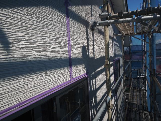 外壁が汚れないように、マスキングテープを貼った後にプライマー(接着材)を塗り、シーリングを打ち込んでいきます。