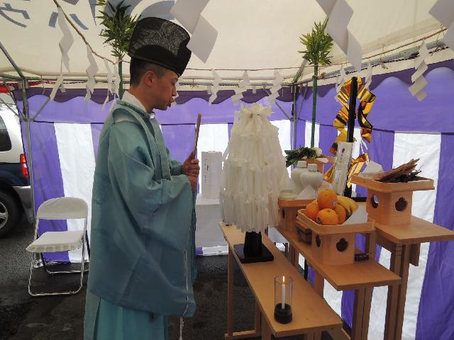 いよいよ地鎮祭です 湯殿山神社 宮司さまの差配で神事を進めていきました。