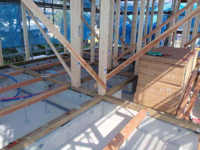 只今 床合板を貼る段取作業をしております。2階では筋交入れ作業をしております。現場周辺の皆様へ工事中は騒音やほこり、特に工事車両の出入りなどで、何かとご迷惑をおかけすることと存じますが、工事中には最新の注意をはらい絶対安全と環境整理に努めてまいります。何卒よろしくお願い申し上げます。