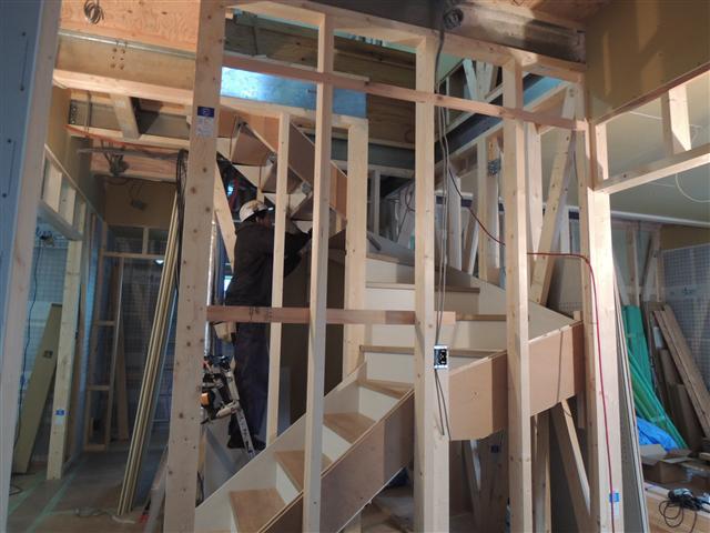 内部では階段取付作業中です。