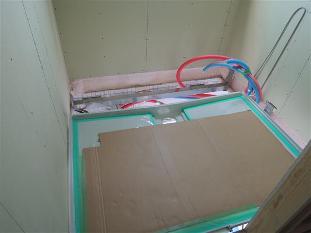 本日、システムバスの組立です。傷がつかないように養生をしながら丁寧に施工していきます。