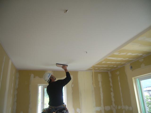 クロス工事の「パテ処理作業」が終了し、クロス貼り開始です。いつものように天井クロスから貼り方開始です。
