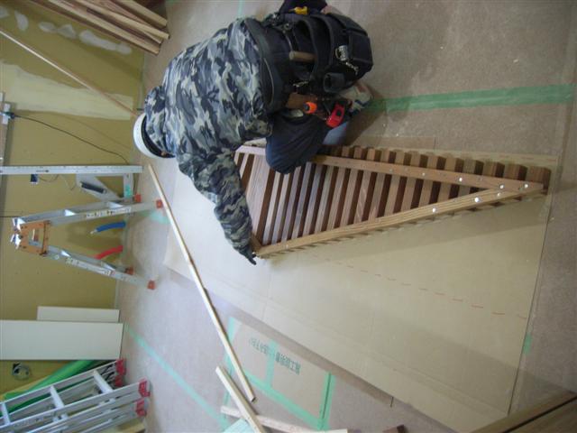 あらかじめ加、塗装を施工した格子材をまずは室内で組立です。