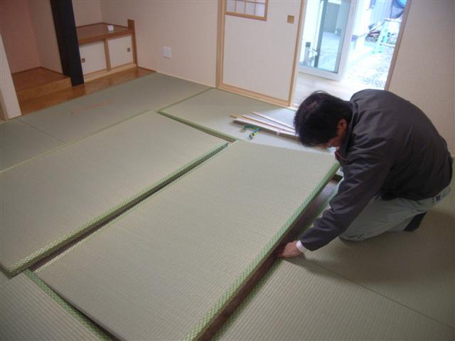 畳やさんが登場し、畳敷込みです。やはり和室は畳が敷き込まれると雰囲気が違いますネ〜。