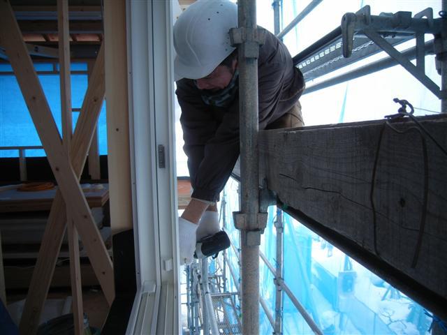 アルミサッシ取付作業です。当現場では、YKK社の樹脂サッシ