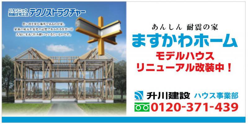 誠に勝手ながらモデルハウスリニューアルの為7月下旬まで休館とさせていただきます。 大変ご迷惑をおかけしますが、宜しくお願い致します。 臨時休館 平成27年6月1日(月)〜 7月下旬(リニューアルOPENは、8月1日(土)の予定です。) お問合せはこちらまで 『ますかわホーム』フリーダイヤル 0120−371−439 http://masukawa.jp e-mail : house@masukawa.co.jp 『パナソニックESテクノストラクチャー』