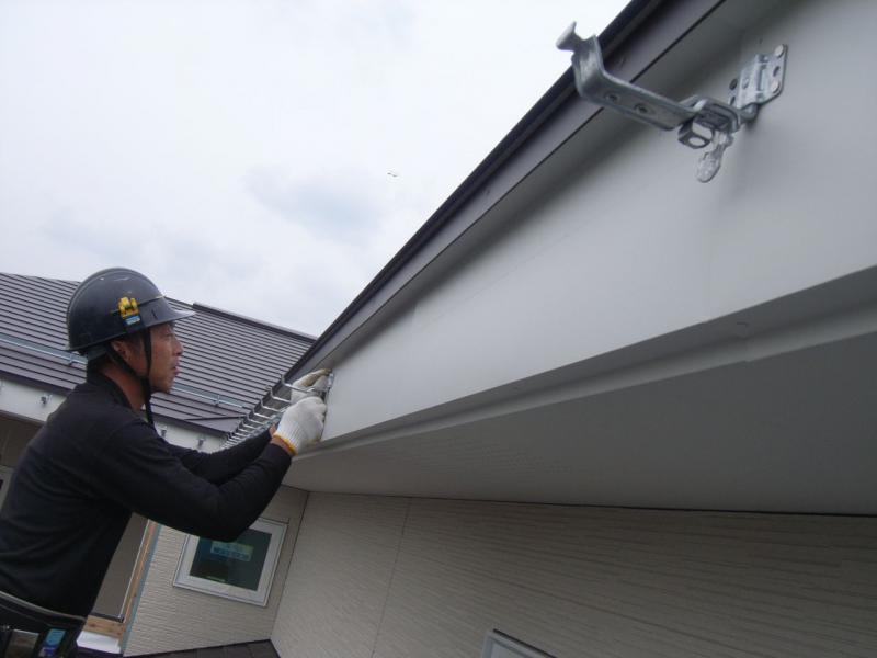 屋根やさんが、軒樋の取付け作業をおこなっております。