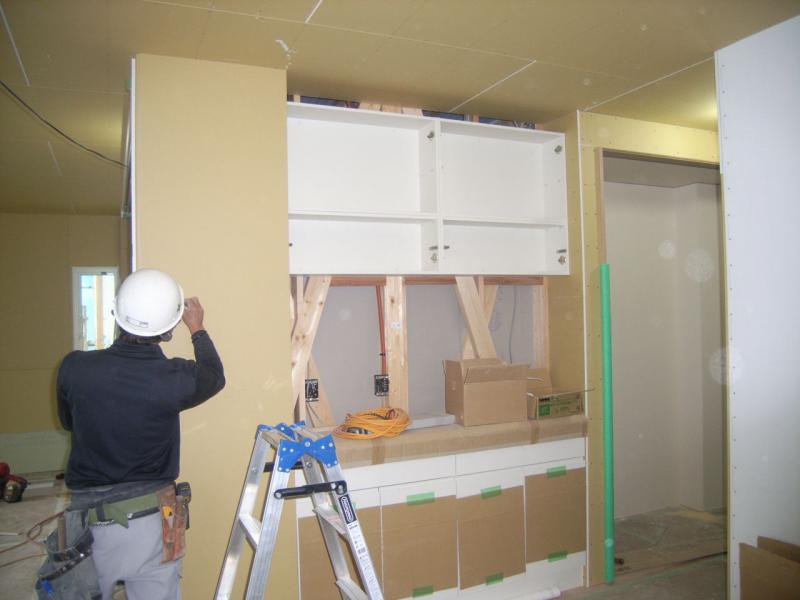 1階の壁石膏ボード貼りももう少しです。本日はキッチン収納廻りのボード貼りを施工中です。