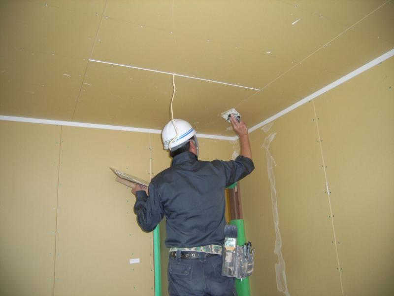 予定より少し早いのですが、クロスやさんが本日より乗り込みです。造作工事の終了している2階からパテ処理開始です。