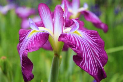 花弁は僅かに波打ち、濃い紅紫に太くハッキリした白の筋が入る。内花被は白地に花弁と同じ色の覆輪がある。