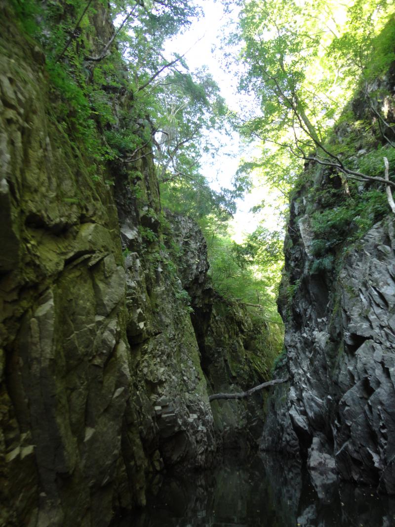 川幅3〜5m、高さ50mを越える迫りくる断崖絶壁の三淵渓谷をゴムボートに乗って通り抜けます。