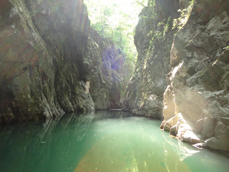 上流部では、卯の花姫伝説が伝わる高さ50mを超える断崖絶壁の三淵渓谷をゴムボートで通り抜けます。