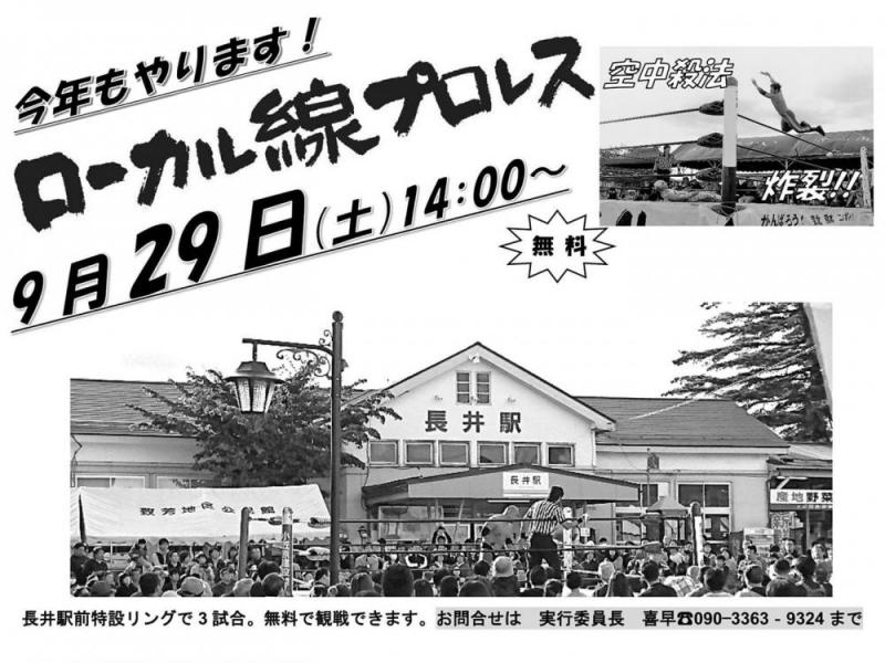 インパクト絶大!今年もやります!!ローカル線プロレス2018開催日時:2018年9月29日(土) 14:00〜場所:長井駅前 特設リング特設リングで行う3試合は無料で観戦できます! お楽しみに!!!!! ローカル線プロレス開催に伴い無料観光循環バス「まわるん」の停車場が一部変更となります。【長井駅】↓【けん玉広場スパイク前 臨時バス停】 ローカル線プロレス 公式ホームページ●問合せ先●主催:ローカル線プロレス実行委員会prowrestling.localline@gmail.com
