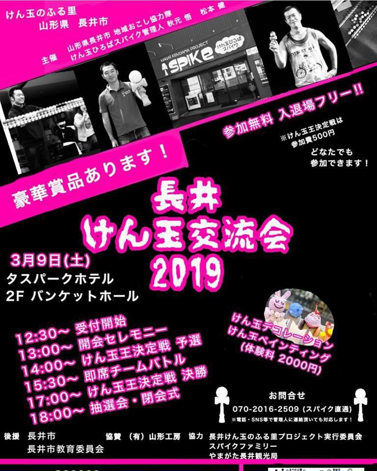 長井けん玉交流会2019けん玉のふる里を代表するイベントが今年も開催!けん玉づくしの一日で盛り上がろう!! 開催日時:2019年3月9日(土)12:30〜18:30会場:タスパークホテル 2F バンケットホール入場無料けん玉王決定戦 参加者500円 ●当日の内容●けん玉王決定戦(変形、変則けん玉を使ったタイムレース)※日本けん玉協会一級程度以上の技量が必要かな?※定員40名・要申込み(3月6日締切)・参加費 500円※ルールは当日発表 即席チーム戦(会場にいるプレーヤーの即席チーム戦)※申込不要、参加費無料 級、段位認定会けん玉検定※申込不要 けん玉体験コーナーけん玉デコ体験コーナー別途体験料が発生します ■申込み・お問い合わせ先■けん玉広場SPIKeけん玉王決定戦の申込方法下記の中からお願いします@けん玉のふる里プロジェクトFacebookページよりメッセージでのお申込みAスパイクの携帯に電話連絡によるお申込みBスパイクのINSTAGRAMへダイレクトメールCメールでのお申込 info@nagai-kendama.com必要事項氏名、当日の連絡先、現住所(市町村まで) けん玉王決定戦の申込期限は3月6日、定員は40名です。様々な賞品を用意してありますので、ふるってご参加ください。 翌3月10日(日)はけん玉交流会 延長戦道の駅に電玉がやってくる!電玉とは本体に内蔵した3種類のセンサーにより、ユーザーが行った技を判定可能な世界初のスマートけん玉です。スマートフォンの専用アプリとBluetoothで接続することで、けん玉の練習や検定、プレイヤー同士の対戦やミニゲーム等さまざまなコンテンツが楽しめます。まさしく…みらいのけん玉☆電玉詳しくはDENDAMA(電玉)ホームページをご覧ください。 鞄d玉から「けん玉芸人 コゾロフ」が登場!電玉の紹介や魅力のPRのほかパフォーマンス披露や実際のバトル体験なども開催します。 ぜひけん玉交流会とあわせて遊びにきておごやい!
