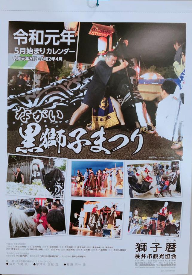 皆様大変お待たせ致しました…! 本日「黒獅子カレンダー」が完成いたしましたのでお知らせいたします。今年の黒獅子カレンダーはなんと…なんと…令和元年5月始まりです!! 令和元年5月〜令和2年4月までのカレンダーはカレンダーとなっております。 ▲すこーしだけ中身をチラッとお見せいたします(´∀`艸)ん〜〜勇敢な警護の迫力がビシバシと伝わってきます…!どのページも最高にかっこいいので、是非お手に取ってみてください♪ 黒獅子カレンダーは◇道の駅 川のみなと長井◇八文字屋長井店◇各コミュニティセンター での販売を予定しております。お気軽にお問い合わせください。 また、本年度で「ながい黒獅子まつり」は30周年の節目を迎えます。そのため今年の黒獅子まつりは2日間の開催を予定しております。(5月18日/19日) チラシが完成次第、御詳細をお知らせいたしますので今暫くお待ちいただければと思います。