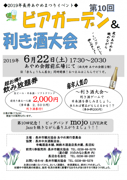 あやめまつり ビアガーデン&利き酒大会の詳細をお知らせします!今年は6月22日(土) 17:30〜20:30 あやめ会館前広場にて行います。 それに伴い、飲み放題券の販売を行っております。前売り券・・・お一人様2000円当日券・・・お一人様2500円(生ビール・日本酒・ソフトドリンク) ※飲み放題は券をご購入の方のみ!飲み放題券には利き酒券も付いております(●´ω`●)ゞ 当日の利き酒大会だけの参加も可能です。(参加料:200円) 前売り券販売所長沼合名会社:0238-88-2007 長井市観光協会(道の駅 川のみなと長井内):0238-88-5279 (平日9:00〜17:00まで)まで 何か御不明な点がございましたらお気軽に長井市観光協会までお問い合わせください。(0238-88-5279)