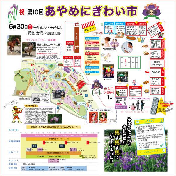令和元年6月30日(日)は今年で、祝10周年目になる【あやめにぎわい市】を開催。『あやめにぎわい市物産販売』では、長井の美味しい物が軒を連ねて皆さんをお待ちしております。また、6月22日(土)に盛況だった『乗馬体験&エサやり体験』の第二弾(予約不可,乗馬希望者は当日会場で整理券を受け取っていただきます)も開催いたします!!是非この機会にお越しいただき、美味しいものに舌鼓をうち、楽しいひと時をお過ごしください。会場別、イベントのタイムスケジュールは以下になります。 【あやめにぎわい市特設会場】◆あやめにぎわい市物産販売 9:30〜16:30※長井のおいしいもの(米沢牛コロッケ、山形牛サイコロステーキ、馬肉肉まん、特性ふわトロ角煮パオサンド、姉妹都市結城市によるとうもろこし等)◆じゃんぼ射的ゲーム 10:00〜15:00※「じゃんぼ射的ゲーム」では、「お菓子」とにぎわい市でおいしいものと交換できる「当たり」を射的でゲットできます(>ω