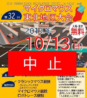 10月13日(日)に開催を予定しておりました「第32回マイクロマウス東北地区大会」につきまして、台風19号の影響による開催の可否を検討、協議を重ねて参りましたが、今年最大規模という連日の気象情報・報道から、公共交通機関の乱れ、来場される選手の皆様の安全等を第一に考慮し、誠に残念ながら中止させていただくこととなりました。選手の皆様には、多大なご迷惑をおかけしますこととともに、直前のご案内となりました事を心より深くお詫び申し上げます。尚、エントリーされた方には別途メールをお送りしております。ご確認くださいますようお願い申し上げます。http://mm.jan.jp/【マイクロマウス委員会東北支部】