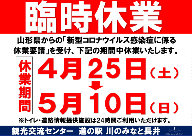 新型コロナウイルス感染拡大防止に伴う「臨時休業」のお知らせ新型コロナウイルス感染防止に係る緊急事態宣言の全国拡大に伴い、山形県からの休業要請施設として「道の駅」も対象となりました。お客様をはじめ、生産者様ならびに従業員の健康・安全が第一となりますので、大変ご不便をおかけしますが、何卒ご理解くださいますようお願い申し上げます。 休業期間2020年4月25日(土)〜5月10日(日)なお4月24日までは営業いたしますが、営業時間は9時〜17時となります。道の駅川のみなと長井 公式ホームページ