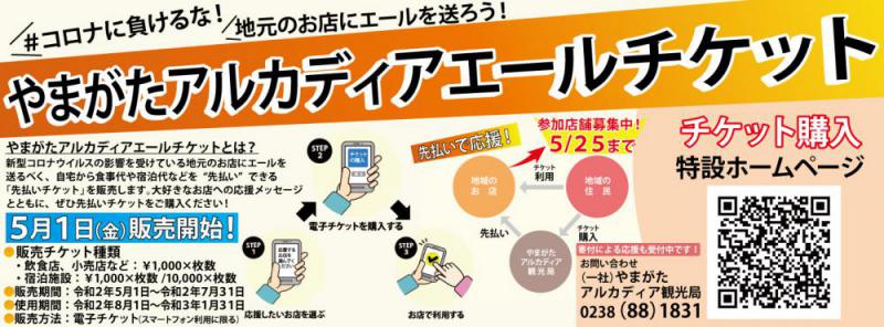 #コロナに負けるな 地元のお店にエールを送ろう!先払いチケットプロジェクト画像クリックで特設ページへ移行します『やまがたアルカディアエールチケット』5月1日から販売開始新型コロナウイルスで苦しむ地元のお店にエールを送るべく自宅から食事代や宿泊代を先払いできる「先払いチケット」を販売します。詳細・販売ページはコチラ1.販売方法:電子チケットのみ(スマートフォンでのご利用に限ります)2.チケットの種類 ・飲食店・小売店など:1,000円チケット×枚数 ・宿泊施設:1,000円チケット×枚数 / 10,000円チケット×枚数※お願い:万が一店舗が閉店してしまった場合は、購入したチケットが使用できなくなる場合がございます。 その際はご支援(寄付)という形で受けさせていただきますので、予めご了承ください。3.チケットの販売期間 令和2年5月1日(金)〜令和2年7月31日(金)4.チケット使用可能期間 令和2年8月1日(土)〜令和3年1月31日(日)5.地元事業者の皆様へ 5/25(月)の17:00まで参加店舗を募集しています。 詳しくは、やまがたアルカディア観光局ポータルサイトをご覧ください。6.問い合わせ先 (一社)やまがたアルカディア観光局 TEL:0238-88-1831詳細・販売ページはコチラ