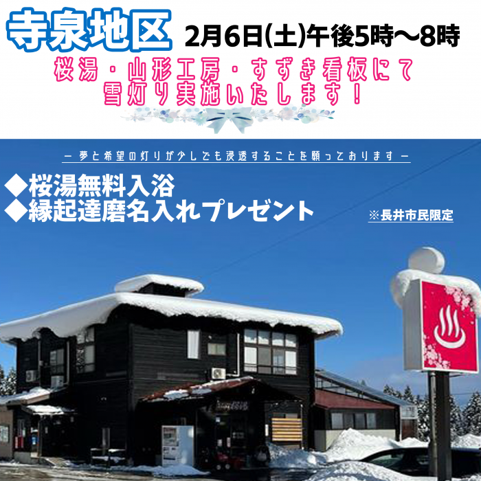 2月6日(土)に開催を予定しております、「ながい雪灯り回廊まつり2021」にて「寺泉地区」と「さくら大橋十字路ローソン向かい」でもイベント企画・ランタン設置をが行われることになりました! :+:-・:+:-・:+:-・:+:-・:+:-・:+:-・:+:-・:+:-・:+:-・:+:-・:+:-・:+:・:+:・:+:・:+: < 寺泉地区 > 午後5時〜8時桜湯・山形工房・すずき看板のそれぞれのスペースで雪灯りのランタンが設置されます ー 夢と希望の灯りが少しでも浸透することを願っております ー 【プレゼント企画】※桜湯にて◆桜湯無料入浴(雪灯りを見に来てくれた長井市民限定)◆縁起達磨名入れプレゼント :+:-・:+:-・:+:-・:+:-・:+:-・:+:-・:+:-・:+:-・:+:-・:+:-・:+:-・:+:・:+:・:+:・:+: < さくら大橋十字路ローソン向かい >ランタン設置 :+:-・:+:-・:+:-・:+:-・:+:-・:+:-・:+:-・:+:-・:+:-・:+:-・:+:-・:+:・:+:・:+:・:+: その他にも各地区でランタンの設置のご協力もお待ちしております!ぜひ、皆様の手作りの素敵なランタンを作り、長井の街なかを暖かな灯りでいっぱいにしましょう…!