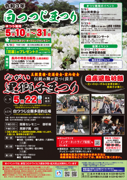 令和3年「白つつじまつり・ながい黒獅子まつり」のチラシが完成いたしましたのでお知らせ致します。(下記の「PDFダウンロード」よりPDFで両面ご確認いただけます) 白つつじまつり期間:令和3年5月10日(月)〜5月31日(月) 5/9(日) 白つつじまつり オープニングセレモニー午前10時〜皇大神社東側広場(古木前)※「花苗」のプレゼント(先着200名) 定数になり次第終了します 期間中長井の特産品販売(土産品限定)つつじ公園内 つつじ館営業時間/10:00〜15:00(※土日は9:00〜17:00)つつじ館内での飲食はでいませんので、予めご了承ください。状況により販売時間の短縮の場合もあります ・‥…━━━☆・‥…━━━☆・‥…━━━☆ まつり期間のイベント 5/9(日)葉山民衆登山時間/6:45集合場所/葉山森林公園(受付は当日集合になります) (登り:勧進代コース/下り:白兎コース)※事前申し込み限定、定員になり次第受付終了いたします申し込み・お問合せ先/長井市観光文化交流課 TEL:0238−82−8017 5/16(日) 雨天決行元祖 投げ銭コンサート時間/13:00〜16:00場所/白つつじ公園内出演/影法師・金子俊郎(オカリナ演奏)問い合わせ先/横澤 TEL:0238−84−0360 5/23(日)チャリティー盆栽(さつき、松柏、雑木) 山野草 大即売会時間/8:00〜17:00会場/白つつじ公園 多目的広場北側特設会場問い合わせ先/長井樹石会・小関 TEL:0238−84−1616 5/21(金)〜23(日) 入場無料第44回 暢神書道会展時間/10:00〜18:00 (最終日は17:00)会場/長井市民文化会館 ・‥…━━━☆・‥…━━━☆・‥…━━━☆ 第31回 ながい黒獅子まつり- 疫病退散祈願 〜災のない平和な世界を願い 黒獅子が舞う〜 - 日時/5月22日(土) 雨天決行場所/白つつじ公園多目的広場 ※今年は市内目抜き通りでの獅子舞は行いません 時間/17:00〜 開幕セレモニー 御祈祷 17:30〜 黒獅子舞 4社※3部入替え制にて入場者数を制限し実施いたします。入場には整理券が必要です 第一部 17:30〜18:25 ●寺泉/五所神社 ●九野本/八雲神社− ※ 入替 ※ −第二部 18:45〜19:10 ●小出/白山神社・皇大神社− ※ 入替 ※ −第三部 19:30〜19:55 宮/總宮神社 ☆…☆…☆…☆…☆…☆…☆…☆…☆…☆…☆… ☆おらんだラジオYoutubeにてインターネットライブ配信も行います!長井市観光協会チャンネルをチェック! ☆番組放送5月29日(土)17:00〜17:30にテレビユー山形で放映いたします!☆…☆…☆…☆…☆…☆…☆…☆…☆…☆…☆… 桟敷席販売について 定数になり次第終了受付開始/5月11日(火) 10:00〜場所/長井市観光協会 (道の駅川のみなと長井) ※ソーシャルディスタンスにご協力ください電話受付/5月11日(火) 10:30〜 TEL:0238−88−5279※席数が制限されていますので、早めの完売が想定されます。予めご了承ください。 整理券のお求めについて今年のながい黒獅子まつりは、入替制のため整理券を発行いたします(1部・2部・3部 各600名)また、新型コロナウイルス感染防止対策として、入口/出口ゲートを設置いたします。それに伴い、当日ゲート付近の混雑を緩和するため、整理券を下記の方法で発行いたします。整理券をお持ちでない方、混雑状況によっては入場をお断りする場合がございます。 ★ スマートフォンからの予約の場合「ながい黒獅子まつり一般入場整理券予約フォーム」から所定の事項を記入しご予約ください。後日、ご入力いただきましたメールアドレス宛に整理番号をご連絡いたします。 予約は→こちらながい黒獅子まつり一般入場整理券予約フォーム ★スマートフォンからの予約が難しい場合ながい黒獅子まつり実行委員会事務局(長井市観光協会)TEL:0238-88-5279 まで電話でのご予約も可能です。※「ながい黒獅子まつり一般入場整理券予約フォーム」から所定の事項をお伺いし、ご予約をいたしますのでお時間に余裕がある時にお問い合わせください。※電話受付は、平日のみ 9:00〜17:00までになります 受付期間5月10日(月) 9:00〜ご予約可能※各部とも制限上限になり次第、受付終了とさせていただきます。制限上限に達しない場合は、当日受付を行いますが定員になり次第入場をお断りいたしますので、予めご了承ください☆…☆…☆…☆…☆…☆…☆…☆…☆…☆…☆… ながい黒獅子まつり感染防止対策についてご来場の際は、マスク着用・手指消毒・検温のご協力をお願いたします ●今年は白つつじ公園多目的広場を会場に行います(市内目抜き通りは使用しません)●会場内では入口・出口ゲートを設けます(検温・消毒・指名などの確認を行います)●会場内は入替制にて入場者数を制限して実施いたします (整理券が必要です) (会場では入場者の上限を設定し、来場者数を管理いたします)●会場内には売店は設置いたしません(公園内には露店は出店しますがテイクアウトのみの販売)また、飲食(アルコール類含)は禁止しています (但し、水分補給などの場合は、水・お茶のペットボトルは可能です)●桟敷席の席数は半分に制限します (ソーシャルディスタンスを保ち、安全に観覧できるよう配慮しています) (桟敷席内での飲食も禁止です)