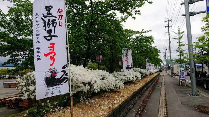 白つつじ公園の外周(国道沿い)の様子です。5/22(土)開催される『ながい黒獅子まつり』。 白つつじに包まれるように幟がたっています! 〜白つつじ公園の開花状況をお知らせします〜現在見頃です! ※ただし、園内、特に早咲きだった部分は天候の影響からか、花が落ちたり、白色→茶色がかってきている部分もございます。行ってみようかな〜…とご検討中の方は是非お早めにご観覧下さい! 園内でもこれからピークを迎える樹齢750余年の古木群【七兵衛つつじ】の様子をご覧ください! 5/19現在 樹齢750余年の古木【七兵衛つつじ】 ☆.。.:*・°☆.。.:*・°☆.。.:*・°☆☆.。.:*・°☆.。.:*・°☆.。.:*・°☆見頃予想や最新状況などは、随時こちらの「長井市ポータルサイト」でお知らせします!是非チェックして下さいね!!長井市の観光パンフレットの送付も行っております。ご希望の方はこちらからお気軽にお問い合わせください! 【長井市観光協会 公式アカウント】長井市観光協会ではFacebook・Instagram・Twitterのアカウントを作成しております。桜、白つつじ、あやめの開花状況をお知らせする他、イベントの情報発信を行う予定です。是非お目通しくださいませ(*^ω^*)!!FacebookInstagramTwitter 《令和3年 ながい黒獅子まつりカレンダー》も販売しております!お買い求めは道の駅川のみなと長井オンラインショップにて♪☆.。.:*・°☆.。.:*・°☆.。.:*・°☆☆.。.:*・°☆.。.:*・°☆.。.:*・°☆