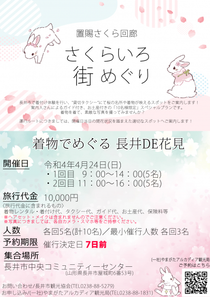 長井市で着付け体験を行い、”貸切タクシー”にて桜の名所や着物が映えるスポットをご案内します!案内人さんによるガイド付き、お土産付きのの「10名様限定」スペシャルプランです!着物が映えるスポットで、素敵な写真を撮ってみませんか?着物を着てみたい方、写真がお好きな方、良い記念・思い出に…! 〇日時:4月24日(日)〇集合時間:1回目 9:00〜14:00(5名) 2回目 11:00〜16:00(5名)〇集合場所:長井市中央コミュニティセンター(山形県長井市屋城町6番53号)〇旅行代金:10,000円(税込)旅行代金に含まれるもの:着物レンタル・着付代、タクシー代、ガイド代、保険料(お土産付)※ヘアセット・メイクは含まれませんので各自でご対応お願い致します。※運行ルートにつきましては開催日当日の開花状況を踏まえた適切なスポットへご案内します。※自由散策の時間も設けておりますので、周辺を着物で巡っていただくことも可能です。 〇お問合せ 長井市観光協会 TEL 0238-88-5279〇ご予約先 (一社)やまがたアルカディア観光局 TEL 0238-88-1831 着物でめぐる長井DE花見ご予約はこちらから!