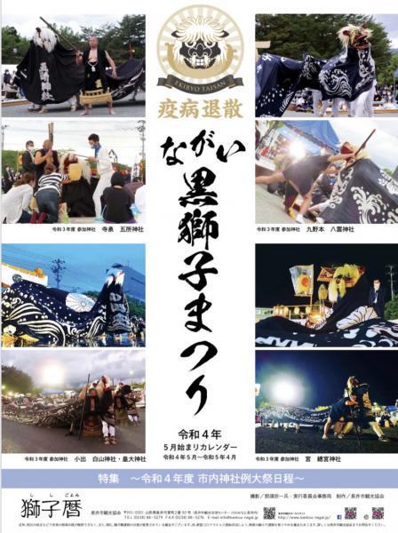 皆様大変お待たせしました!!「ながい黒獅子カレンダー2022」が発売開始となりました。 今回のカレンダーは、昨年度行われました「第31回ながい黒獅子祭り」に参加した五所神社・八雲神社・小出白山皇大神社・總宮神社の写真が使われています!また、今年度から長井市内の神社の例祭日が分かりやすくなりました(/・ω・)/ こちらのカレンダーは1本1000円で販売しております。販売場所は、道の駅川のみなと長井・八文字屋長井店・新来軒・春まちカフェ・各所コミセンにて本日より販売開始です! また、道の駅川のみなと長井のオンラインショップでも取り扱っております。遠方の方でもお気軽にご購入できますので、是非サイトをチェックしてください!!道の駅川のみなと長井オンラインショップ 素敵なカレンダーが完成いたしましたので、ご堪能いただければと思います! ☆.。.:*・°☆.。.:*・°☆.。.:*・°☆☆.。.:*・°☆.。.:*・°☆.。.:*・°☆見頃予想や最新状況などは、随時こちらの「長井市ポータルサイト」でお知らせします!是非チェックして下さいね!!置賜さくら回廊や長井市の観光パンフレットの送付も行っております。ご希望の方はこちらからお気軽にお問い合わせください! 【長井市観光協会 公式アカウント】長井市観光協会ではFacebook・Instagramのアカウントを作成しております。桜、白つつじ、あやめの開花状況をお知らせする他、イベントの情報発信を行う予定です。是非お目通しくださいませ(*^ω^*)!!FacebookInstagram☆.。.:*・°☆.。.:*・°☆.。.:*・°☆☆.。.:*・°☆.。.:*・°☆.。.:*・°☆