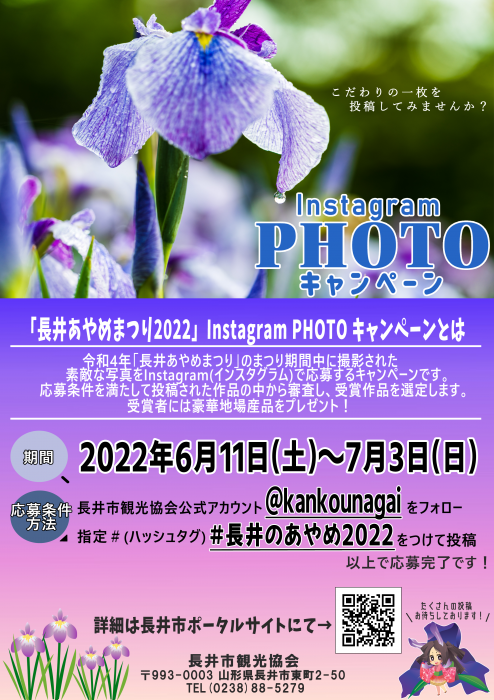 長井のあやめ2022 Instagramフォトキャンペーン 1.「長井のあやめ2022」instagramフォトキャンペーン とは 長井あやめまつりで撮影した素敵な写真をInstagram(インスタグラム)で募集するキャンペーンです。応募条件を満たして投稿された作品の中から審査し、受賞作品を選定します。受賞者には地場産品をプレゼント! 2. 応募期間 あやめまつり期間内【2022年6月11日(土)〜 2022年7月3日(日)】 3. 応募資格 応募者自身の Instagram アカウントを持っている方ならどなたでもご応募できます。(年齢、性別、国籍、住所地、プロ・アマは問いません)※未成年の方は保護者の同意が必要です。未成年の方が応募された場合は、保護者の同意が得られているものとみなします。 4.応募条件及び応募方法 ご応募カンタン♪@長井市観光協会の公式アカウント @kankounagai をフォローし、A指定#(ハッシュタグ) #長井のあやめ2022 を付けて投稿するだけ!以上で応募完了です。もちろん既にフォロワーの方も大歓迎!たくさんのご応募お待ちしております。 応募作品は、応募者本人が撮影した『長井あやめまつり2022』に関する写真に限ります。 一人何回でも応募可能ですが、同じ作品を複数回応募することはできません。 一投稿が複数枚の写真から構成される作品の場合、1枚目の写真が対象となります。 複数画像を組み合わせて1つの画像として投稿した作品も対象となります。 応募作品については当協会から写真データの提供をお願いする場合があります。結果発表までデータを削除しないようにお願いします。5.賞品 【最優秀賞】: 米沢牛【10,000円相当】※1点【優秀賞】: 地場産品詰め合わせ【5,000円相当】※2点【特別賞】: 地場産品詰め合わせ【3,000円相当】※数点6.結果発表 ? 応募作品は長井市観光協会が審査の上、【最優秀賞】【優秀賞】【特別賞】を決定します。? 受賞された方には賞品をお渡し(又は発送)するため、公式アカウント(@kankounagai)から個別に Instagram のダイレクトメッセージ機能でご連絡を差し上げます。(※ご連絡)? 結果発表については、受賞者との調整が終了後、公式アカウント及び長井市観光ポータルサイト上で発表します。(結果発表の時期は2022年7月中旬を予定) ● 留意事項 (必ずお読みください)【長井あやめまつり2022 フォトキャンペーン】(以下、「本キャンペーン」という)に応募の方は、以下の内容に同意いただいたものとみなします。 本キャンペーンは Instagram が支援、運営、承認、関与するものではありません。また、Instagram をご利用の際は、本留意事項の他、Instagram の規約を遵守してください。なお非公開アカウントでは投稿が確認できませんので、必ず公開アカウントでの投稿をお願いします。 同一または類似作品が、過去に他のフォトコンテスト等で受賞して画像が確認できる作品、他のフォトコンテスト等への応募が確認できる作品は応募できません。 応募作品の著作権は応募者に帰属しますが、長井市のPR・広報宣伝・プロモーション等のために使用又は第三者へ提供する場合があります。無償での二次使用にご承諾いただける方のみ、応募をお願いいたします。 作品内で確認できる対象物によって肖像権や著作権等の第三者の権利侵害があった場合、当協会では一切責任を負いません。応募者ご自身の責任での本キャンペーンへの応募をお願いいたします。 応募期間内に参加者がアカウントを削除した場合や、被写体や撮影地が長井市との関連性が低いことが判明した場合、その他当協会がキャンペーンの運営上望ましくないと判断した場合、公式アカウント内での写真の掲載を取り止め、エントリーを無効とします。 受賞者には賞品をお渡し(又は発送)するため、個人情報をご連絡いただきます。個人情報は、受賞者に賞品をお渡し(又は発送)するためのみに利用いたします。 通信上のリスクはご理解の上、本キャンペーンに応募いただきますようお願いします。万が一、第三者の違法行為により、参加者の個人情報が漏洩してしまった場合については、当協会に過失が無い限り一切の責任を負いかねます。 当協会が本要項の内容を改定した場合には、公式アカウント及び長井市観光ポータルサイト上に掲載して参加者にお知らせいたします。