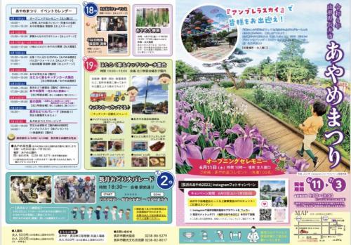 令和3年度「あやめまつり」のチラシが完成致しましたのでお知らせいたします。 あやめまつり期間:6月11日(土)〜7月3日(日) バージョンアップ!「アンブレラスカイ」で皆さまをお出迎え♪梅雨のこの時期はどうしても気分がふさがりがち…そんな気分を晴れやかに、顔を上げてみよう!!空が鮮やかに彩られる「映えスポット」2022年は傘のデザインをアレンジ!「ステンドグラス柄」や「レインボー柄」などが登場!【設置場所:北入園口】 6月11日(土)・オープニングセレモニー 10時〜【北入園口】 ご祈祷・あやめ苗プレゼント(先着100名)・あやめ歌謡会 歌謡祭 13時30分〜15時30分 【水上ステージ】 6月12日(日)・夢蔵みんなのカラオケショー 13時30分〜15時30分 【水上ステージ】 6月17日(金)〜6月19日(日)・あやめ大華展 10時〜17時(入館は16時30分まで) 【丸大扇屋】 長井の市の花である「あやめ」を使い、長井華道四流派の先生方が、 丸大扇屋の雰囲気に合わせた華をいけます。 6月18日(土)・出張!けん玉ひろばSPIKe 10時30分〜16時 【あやめ会館前】・けん玉パフォーマンス 10時30分〜 【水上ステージ】・小桜幼稚園 鼓笛隊 演奏 11時〜 【水上ステージ】 6月19日(日)・あやめ写生大会 9時〜11時 【園内】・はたらく車&キッチンカー大集合 10時〜15時 【北口特設会場/あやめ会館前】 6月25日(土)・長井おどり練習会(雨天中止) 17時〜19時 【園内】・あやめ夜市〜花と光と音楽と〜 17時30分〜20時30分 ◆じゃんけん大会 豪華景品ゲットのチャンス! 18時30分〜 ◆mojoジャズライブ 19時〜 ◆キッズエンジョイ企画 (ふうせんたけさん/射的ゲーム(1回(3発)100円) ◆アンブレラスカイライトアップ ー 長井おどり練習会 ー17時〜19時予定(園内) ※雨天中止7月2日(土)に開催の「長井おどり大パレード」に向け、あやめ公園にて練習会を行います。とび入り参加OK!団体・個人問わず、どなたでもお気軽にご参加ください! 6月26日(日)・食の祭典〜応援したいお店にエールを!長井おまつりグルメ大賞〜 10時〜15時あなたのイチオシに投票!「応援したいお店グルメ大賞」を決定します。《お楽しみ特典♪》ご来場いただいた方へコイン1枚プレゼント!(小学生以上)コイン1枚で買い物券が当たるガラポン抽選にご参加できます! ・長井の伝統神事 黒獅子舞(總宮獅子舞保存会)〈1回目〉11時〜 〈2回目〉13時〜 園内 7月2日(土)・長井おどり大パレード 18時30分〜 【駅前通り】 売店&観覧席もあるよ♪ 7月3日(日) あやめクロージング・あやめ写生大会表彰式 13時30分〜14時 【園内無料休憩所】・アンブレラスカイ《傘プレゼント》※数量限定 14時〜 【園内】 「長井のあやめ2022」Instagramフォトキャンペーン!Instagramで投稿された応募写真の中から、選ばれた方には豪華賞品をプレゼント!米沢牛や地場産品セットなど豪華景品ゲットのチャンス。応募は簡単、どなたでもお気軽にご応募ください! 応募期間:6月11日(土)〜7月3日(日)応募条件などの詳細はこちらからご確認ください!●Instagramで長井市観光協会のアカウント @kankounagai をフォローし●指定#(ハッシュタグ)「#長井のあやめ2022」を付けて投稿しよう! ○● 新型コロナウイルス感染予防対策について ●○・ご来園の際はマスクの着用の上、手指消毒、検温のご協力をお願いします。 発熱や体調不良が認められる方の来園はご遠慮ください。・ソーシャルディスタンスを保ってご観覧ください。・出店については主にお土産品販売、飲食についてはテイクアウト方式のみとし、飲食のためのテーブル等は設置しておりませんので予めご了承ください。 ・入園料等は変更ございません。 (大人500円(20名様以上の団体400円)/小人200円(小・中学生)(20名様以上の団体100円)・入園料有料期間中に福祉施設等のカリキュラムの一環であやめ公園を入園される場合、 あやめ公園入園料の減免を行っています。→ 減免についてはこちら その際は障害者手帳かミライロ(アプリ画面)の提示をお願いします。(対象の方は入園料が半額になります) あやめチラシ2022表 あやめチラシ裏