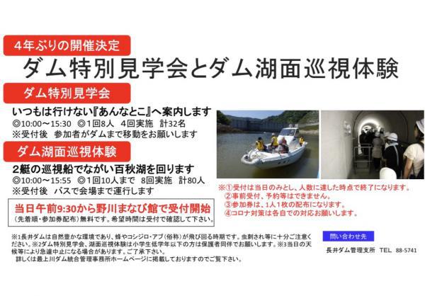 大変お待たせいたしました。4年ぶりの開催となります「ダム特別見学会とダム湖面巡視体験」の情報をお伝え致します。 ■□ ダム特別見学会 □■いつもは行けない『あんなところ』へ案内します!◎10:00〜15:30 ◎1回8人 4回実施(計32名)※受付後 各々ダムまで移動をお願いします。 ■□ ダム湖面巡視体験 □■2艇の巡視船でながい百秋湖を回ります。◎10:00〜15:55 ◎1回10人 8回実施(計80人)※受付後、バスで会場まで運行します ◆当日午前9:30から野川まなび館で受付開始 ◆(先着順・参加券配布) 無料です。 ◆希望時間は受付でご確認ください 《 注意事項 》・長井ダムは自然豊かな環境であり、蜂やホシジロ・アブ(俗称)が飛び回る時期です。虫刺され等には十分ご注意ください。・ダム特別見学会、湖面巡視体験は小学生低学年以下の方は保護者の同伴でお願いします。・当日の天候等により急遽中止になる場合がございます。ご了承ください。詳しくは最上川ダム統合管理事務所ホームページに掲載しておりますのでご覧下さい。 ※最も重要な注意事項は下記になります ※受付は当日のみとし、人数に達した時点で受付は終了する予定です。 事前受付・予約等はできません。 参加券は、1人1枚の配布になります。 コロナ対策は各自での対応をお願いします。 問い合わせ先長井ダム管理支所 TEL:0238−88−5741HP https://www.thr.mlit.go.jp/mogami/