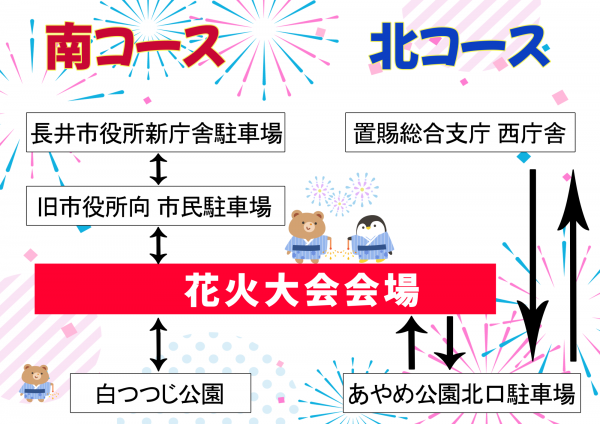 9月3日(土)に開催を予定しております、最上川花火大会時の無料シャトルバス運行についてのお知らせです。 ワゴン車(定員13名乗り)が運行します。花火会場の発着場所は「舟場公民館」を予定しております。北コースは循環、南コースは直行便です。 コースに関しましてはこちらの記事の上部、イベントチラシ、花火大会プログラムに記載されております。事前に会場付近の駐車場や、シャトルバスのコースをご確認いただけますよう、御協力をお願い致します。 尚、午後5時以降の会場内への車の乗り入れはできませんので、予め御了承ください。