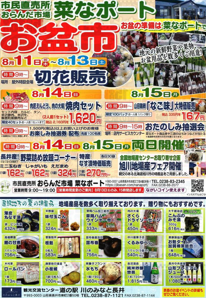 市民直売所 おらんだ市場 菜なポート『お盆市』【切花販売】8/11(木)〜8/13(土)まで※13日(土)のみ15:00閉店となります また、14日(日)にはお得な【焼肉セット】・15日(月)には【山田鶏卵「なご味」】の大特価販売!その他、「野菜詰め放題」や「旭川地場産品フェア」を実施予定です! お盆の準備は「菜なポート」で!詳しくはチラシをチェック!!(*'▽')