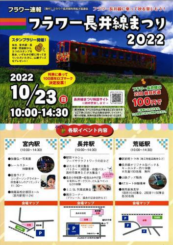 10月23日(日) 「フラワー長井線まつり2022」が開催されます。時間:10:00〜14:30 各駅イベント・スタンプラリーが行われます。詳しい内容はこちら「フラワー長井線まつり特設サイト」 お問い合わせ先 山形鉄道株式会社 (電話:0238-88-2002)