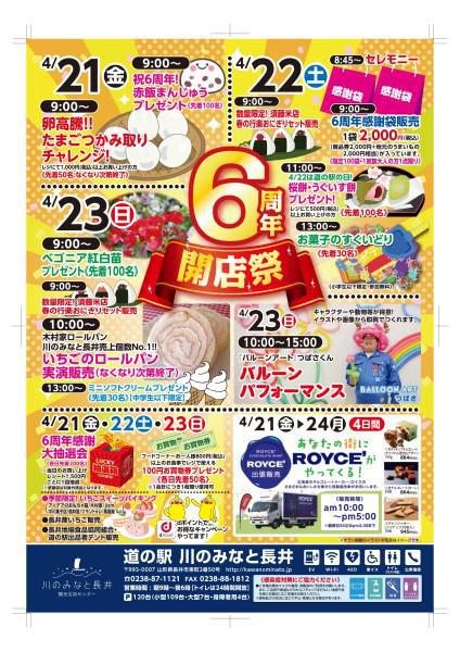 4月21日〜23日までの3日間「道の駅川のみなと長井 6周年開店祭」が行われます。6周年感謝大抽選会や、季節限定!いちごのスイーツバイキングなど楽しいイベント盛りだくさんです。また各日限定のイベントも行われます。d(^^*) 4月21日9:00〜 卵高騰!!たまごつかみ取りチャレンジ!(先着50名様) 祝!6周年赤飯まんじゅうプレゼント!(先着100名様) 4月22日8:45〜 セレモニー9:00〜 6周年感謝袋販売(限定100袋・1家族様大人の方1点限り) 数量限定!須藤米店 春の行楽おにぎりセット販売11:00~ 桜餅・うぐいす餅プレゼント!(先着100名様)13:00~ お菓子のすくいどり(先着30名様・小学生以下限定) 4月23日9:00〜 ベコニア紅白苗プレゼント(先着100名様) 数量限定!須藤米店 春の行楽おにぎりセット販売10:00~ いちごのロールパン実演販売(なくなり次第終了)13:00~ ミニソフトクリームプレゼント(先着30名様・中学生以下限定)10:00~15:00 『バルーンアート』つばさくん バルーンパフォーマンス 4月21日〜23日6周年感謝大抽選会(各日先着200名様) 当日お買い上げレシート1500円ごと1回抽選※感謝袋は対象外商品となります。フードコーナーお1人様800円以上のお食事でレジで使える100円お買物券プレゼント!(各日先着50名)季節限定!いちごのスイーツバイキング 4月21日〜24日ROYCE'出張販売 ≪販売時間am10:00〜pm5:00≫ 詳しくはチラシをご覧ください。皆様のお越しをお待ちしております。(´∀`●)