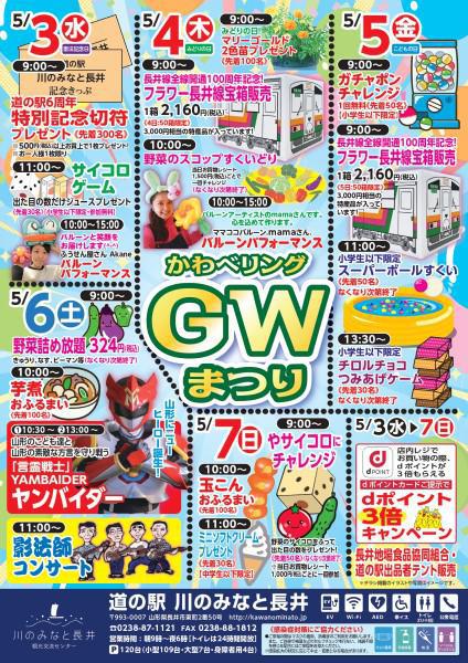 5月3日〜7日の5日間、道の駅川のみなと長井では「かわべリングGWまつり」を開催!道の駅6周年特別記念切符やフラワー長井線宝箱販売、「言霊戦士」YAMBAIDER ヤンバイダー、影法師コンサートなど楽しいイベント盛りだくさんです。 詳しくは下記または、チラシをご覧ください。 5月3日9:00~ 道の駅6周年特別記念切符プレゼント(先着100名) ※500円以上(税込)お買上で1枚プレゼント・お1人様1枚限り11:00〜 サイコロゲーム 出た目の数だけジュースプレゼント (先着30名・小学生以下限定)10:00~15:00 ふうせん屋さんAkane バルーンパフォーマンス 5月4日9:00~ マリーゴールド2色苗プレゼント(先着100名)9:00~ 長井線全線100周年記念!フラワー長井線宝箱販売(4日:50箱限定)10:00~ 野菜のスコップすくいどり(なくなり次第終了) ※当日お買物シート1500円(税込)で一回チャレンジ10:00~15:00 ママココバルーン.mamaさん バルーンパフォーマンス 5月5日9:00~ ガチャポンチャレンジ 1回無料(先着50名・小学生以下限定)9:00~ 長井線全線100周年記念!フラワー長井線宝箱販売(5日:50箱限定)11:00~ 小学生以下限定スーパーボールすくい(先着50名・なくなり次第終了)13:30~ 小学生以下限定チロルチョコつみあげゲーム(先着30名・なくなり次第終了) 5月6日9:00~ 野菜詰め放題(なくなり次第終了)10:00~ 芋煮のおふるまい(先着100名)10:30~ 13:00~ 「言霊戦士」YAMBAIDER ヤンバイダー11:00~ 影法師コンサート 5月7日9:00~ やサイコロにチャレンジ(先着50名・なくなり次第終了) ※当日お買物シート1000円(税込)で一回参加!10:00~ 玉こんおふるまい(先着100名)11:00~ ミニソフトクリームプレゼント(先着30名・中学生以下限定) 皆様是非お越しください。 道の駅川のみなと長井 営業時間 9:00~18:00