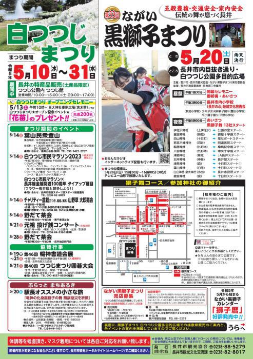 白つつじまつり まつり期間/5月10日(水) 〜 31日(水) オープニングセレモニー5月13日(土)午前10時〜 皇大神社東側広場(古木前)芝桜の花苗プレゼント(先着200名) まつり期間のイベント《 5月14日(日) 葉山民衆登山 》集合場所/はぎ苑駐車場(受付場所) 午前6時30分受付(午前7時30分出発)参加料/1,000円(保険料・入浴料・写真代・登山口までのバス往復)登り:勧進代口、下り:白兎コース問い合わせ/長井山岳会(鈴木) TEL090-9423-2767 《 5月14日(日) 白つつじ市民マラソン大会2023 》(雨天決行※順延なし)時間/午前7時30分 受付開始/午前8時35分 閉会行事◎ジョギング種目 ・ファミリーラン 2.2km ・ファンラン 2.2km ・エンジョイラン5.0km コース/長井市市役所発着 市街地周回コース◎ウォーキング種目 ウォーキング7.3km コース/最上川フットパス周遊コース 白つつじ市民マラソン×長井線全線開通100周年タイアップ種目「フラワー長井線と競争しよう!」問い合わせ/長井市健康スポーツ課スポーツ推進室内TEL/0238-82-8009 《 5月14日(日) チャリティー盆栽(さつき、松柏、雑木) 山野草 大即売会 》時間/午前8時〜午後5時会場/白つつじ公園 多目的広場北側特設会場問い合わせ/長井樹石会・小関 TEL0238-84-1616 《 5月14日(日) 野だて茶会 》時間/午前9時30分〜午後3時 ・表千家清友会 《 5月21日(日) 元祖投げ銭コンサート(小雨決行) 》時間・場所/白つつじ公園内 午後1時〜4時 出演/影法師問い合わせ/0238-84-0360(横澤) 《 5月28日(日) 野だて茶会 》時間/午前9時30分〜午後3時 ・長井地区同門会 協賛行事《 5月19日(金)〜21日(日) 第46回 暢神書道会展 》時間/午前10時〜午後6時(最終日は午後5時) 入場無料会場/長井市民文化会館 《 5月21日(日) 第40回つつじまつり囲碁大会 》受付/午前9時30分 開始/午前10時会場/置賜生涯学習プラザ会費/1,500円(昼食代別)問い合わせ/090-4557-8559(梅津) 《 ぶらっと まちあるき 》5月20日(土) 駅長オススメ小さな旅「竜神の化身黒獅子の舞 無病息災を祈願」安寧を祈る黒獅子の歯打ちの音が町中に響き渡り、それぞれ特徴のある勇敢な舞は人々を魅了します。「水が集まるところ」に由来する長井のまちなかには、文字通り水路が張り巡らされています。集合場所/山形鉄道 長井駅 時間/午前11時35分募集人員/20名 所要時間/約4時間20分お申し込み/(一社)やまがたアルカディア観光局 TEL0238-88-1831 《 ながい黒獅子まつり 》日時/5月20日(土) ※雨天決行場所/長井市内目抜き通り・白つつじ公園多目的広場【昼祭】午後1時30分〜 開幕セレモニー(ご祈祷・あいさつ)午後2時00分〜 長井市内小学校「長井の心」地域文化発表会 〈参加小学校〉少年少女河井獅子踊り(豊田小学校) 平小獅子踊り(平野小学校)【夜祭】午後5時00分〜 あいさつ 黒獅子舞(12社)伊佐沢神社(上伊佐沢) → 公園お宮スタート豊里神社(時庭) → 錦屋十字路スタート白山神社(十日町) → 菜なポートスタート若宮八幡神社(河井) → 阿達医院スタート稲荷神社(九野本) → 桑島記念館スタート八雲神社(九野本) → 中央十字路スタート津嶋神社(草岡) → JA長井スタート五所神社(寺泉) → 長井駅スタート津島神社(森) → 十日町スタート1葉山神社(白兎) → 十日町スタート2白山神社・皇大神社(小出) → 長井市役所スタート總宮神社(宮) → 十日町スタート3 ●まつりの模様は、5月28日(日)午後3時30分〜4時にテレビユー山形で放送致します。●おらんだラジオ インターネットライブ配信も行います。 《 ながい黒獅子まつり 桟敷席について 》A席(86升)・・・1升4,000円(直敷)B席(48升)・・・1升3,000円(約40センチ高)※A/B席共に、1升2名定員(90センチ×180センチ コンパネ)お子様は1升内幼児・低学年1名であれば同席可能(中学年〜、2名は禁止)※飲食は可能です。 《 お求め方法・予約開始日時 》受付開始/5月10日(水) 午前10時〜会場/長井市観光協会(道の駅 川のみなと長井内)※ソーシャルディスタンスにご協力ください電話受付/午前10時30分〜 TEL0238-88-5279 (定員になり次第終了)◎桟敷席購入以外の方のご利用は、他のお客様に御迷惑がかかりますので、ご遠慮ください。(※桟敷席券のない方のご着席は固くお断りしています)◎不適切行為があった場合は、退席をいただく場合がございます。 注意事項・桟敷席購入以外のご利用は、他のお客様の御迷惑がかかりますのでご遠慮ください。 (桟敷席券の無い方のご着席は固くお断りしています)・不適切行為があった場合は、退席をいただく場合がございます。 ながい黒獅子まつり 感染防止のお願い◎ソーシャルディスタンスの確保・消毒液の設置を行い、基本的な感染防止対策を実施します。 マスクの着用については、各自でのご判断をお願い致します。◎今度、5類への位置づけとする方針を鑑み現状に則した対策を講じます。 開催内容が変更になる場合がございますので、その際は順次告知致します。 チラシ内容につきましてはPDFにてご確認ください。